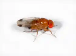 Definition Die Kirschessigfliege (Drosophila suzukii) gehört zur großen Gruppe der Tau-, Obst- oder Essigfliegen aus der Familie (Drosophilidae). Die charakteristischen Merkmale sind, dass sie eine Länge von etwa 2–3,5 mm und eine Spannweite von 5–6,5 mm hat. Ihr Körper ist gelb bis braun gefärbt mit dunkleren Streifen auf dem Bauch und sie hat rote Augen. Das Männchen hat einen deutlichen, dunklen Fleck nahe der Spitze jedes Flügels. Die Weibchen haben keine gefleckten Flügel. Das Weibchen hat einen langen, scharfen, gezähnten Eiablageapparat. Mit diesem ritzt es die Früchte auf und legt die Eier hinein.