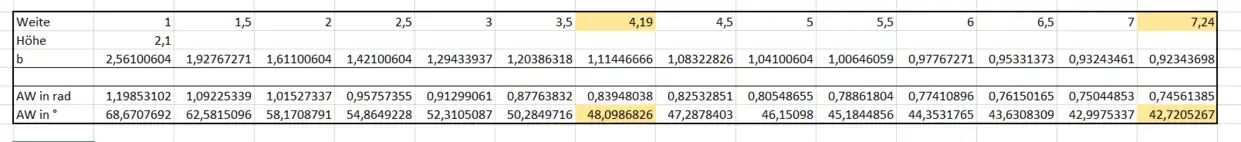 Zur Bestimmung der Abwurfwinkel mit Betrachtung verschiedener Distanzen zum Korb und einer gewählten Abwurfhöhe (2,10m, Abwurfhöhe von einem der Referenten) verwenden wir folgende Formel: