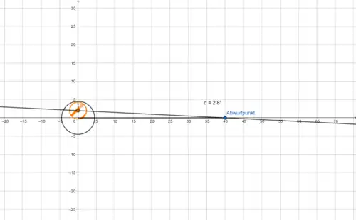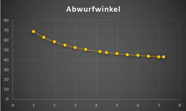 Für die Ermittlung dieser Daten haben wir betrachtet, wie sich die Abwurfgeschwindigkeit je nach Abwurfwinkel verhält. Hierfür variierten wir den Abwurfwinkel zwischen 38° und 61°, da alle Winkel außerhalb dieser Spanne für unser Modell unrealistisch wirken. Als einzige wirkende Kraft verwendeten wir die Gravitationskraft, welche die Geschwindigkeit in y-Richtung beeinflusst. Die Formel von der Abwurfgeschwindigkeit haben wir von der y(x)-Formel des Schrägen Wurfs hergeleitet (zur Herleitung).