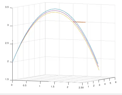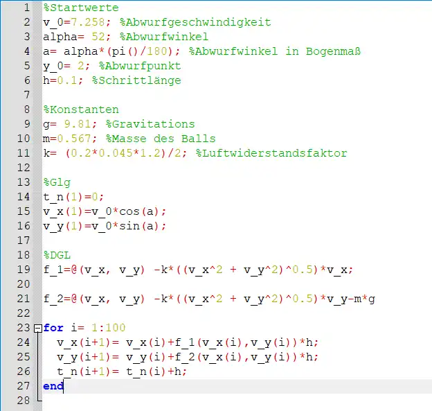 Wir benutzen das explizite Euler-Verfahren zur Lösung der Differentialgleichungen und benutzen Octave, um das Euler-Verfahren anzuwenden. Hier das Skript für eine Abwurfgeschwindigkeit von 7,258 m/s bei einem Abwurfwinkel von 52°.