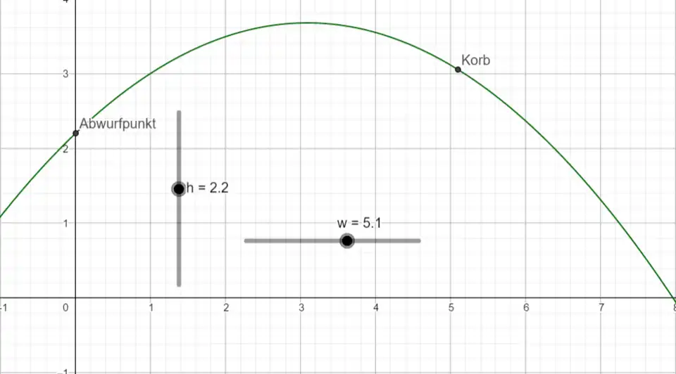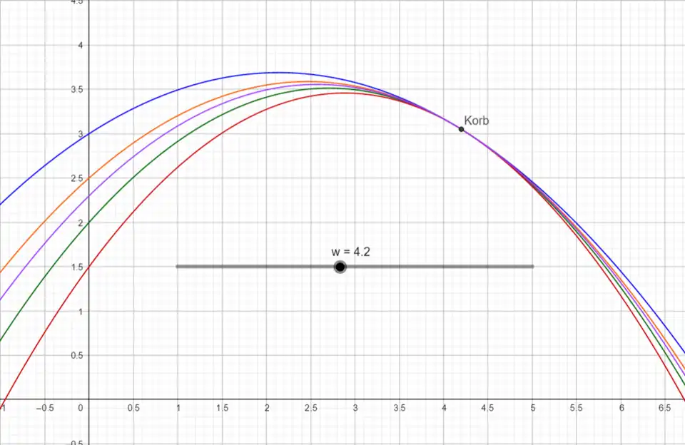 Mithilfe von GeoGebra können wir eine Funktionsschar und einen Funktion mit Schiebereglern plotten, um die Wurfparabeln zu visualisieren:
