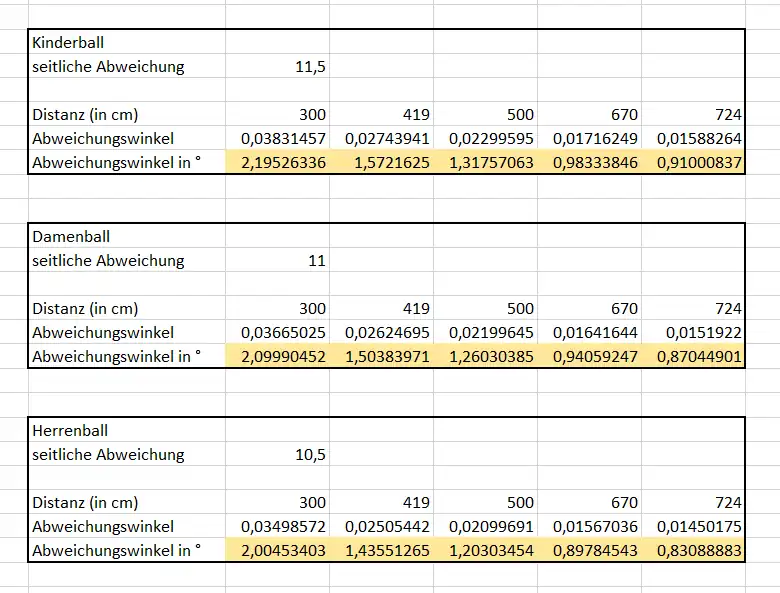 Von oben betrachtet kann man eine gerade Linie zwischen dem Werfer und der Korbmitte ziehen. Wir wollen nun bestimmen um wie viel Grad der Wurf von dieser idealen Linie abweichen kann. Hierfür variieren wir wie gehabt die Ballgrößen und zusätzlich die Distanz zum Korb. Den Winkel erhalten wir indem wir uns das Dreieck mit der seitlichen Abweichung als Gegenkathete und die Distanz zum Korb als Ankathete betrachten. Der Abweichungswinkel zur optimalen Linie erhalten wir folglich aus dem Arcus Tangens der beiden Katheten. Wir haben unterschieden zwischen Nahdistanz(3m), Freiwurf (4,19m), Mitteldistanz(5m), Ecken-Dreier(6,7m) und dem normaler Dreipunkte Wurf (7,24m). Um dies übersichtlich zu bestimmen, verwenden wir ein Tabellenkalkultionsprogramm.