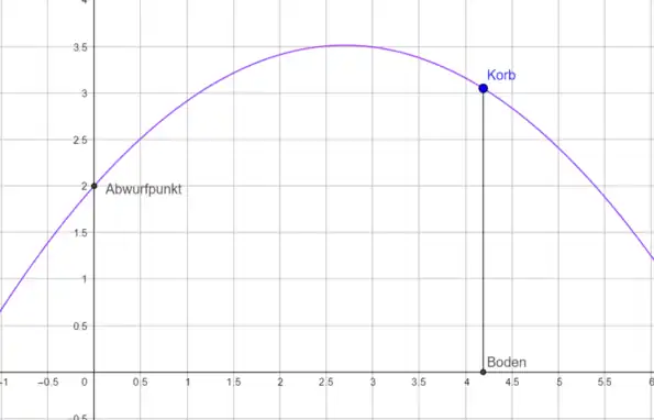Im ersten Zyklus bestimmen wir die Wurfparabel eines Positionswurfes beim Basketball mit minimalem Kraftaufwand und den dazugehörigen Abwurfwinkel. Hierfür geben wir den Abstand zum Korb (4,19m/Freiwurf) und die Abwurfhöhe (2m) vor. Des Weiteren übernehmen wir den minimalen Einfallwinkel aus dem vorherigen Modellierungszyklus. Mithilfe der gegebenen Größen erhalten wir folgende Funktionsgleichung (zur Rechnung):