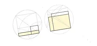 Vom gegebenen Rechteck (gelb) ausgehend wird mit dessen Langseite a ein Kohärenzsystem „grosses Quadrat“ mit einem Umkreis dazu gezeichnet. Im Schnittpunkt der eingezeichneten Quadratdiagonale mit der inneren Rechteck-Langseite wird eine senkrecht stehende Gerade gezeichnet, die aussen die Kreislinie schneidet. Um den rechten unteren Rechteckpunkt wird dann ein Kreis durch die äusseren Schnittpunkte auf dem Kreis gezeichnet. Dieser Kreis schneidet innen die Quadratdiagonale und markiert mit dem Schnittpunkt die gesuchte Quadratecke. Durch diesen Eckpunkt wird eine Parallele zu den Rechteck-Langseiten gezeichnet, Diese Parallele schneidet die Seiten des grossen Quadrates. Schliesslich wird eine Strecke vom rechten unteren Rechteckpunkt zum besagten Schnittpunkt auf der linken Quadratseite gezeichnet. Diese Strecke ist eine Symmetriegerade. Sie zeigt anschaulich logisch nachvollziehbar die gezeichnet berechnete Flächengleichheit. Die beiden an den inneren Quadratseiten anliegenden Rechtecke sind aus Gründen der Symmetrie gleich gross und damit ist die gesuchte Quadratfläche gleich gross zur gegebenen Rechteckfläche. Die zweite gezeichnete Berechnung macht mit der anderen Rechteckgröße die Allgemeingültigkeit des vorgezeigten Kohärenzsystems deutlich.