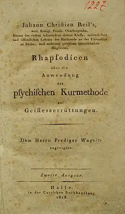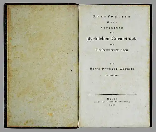 Reil, Johann Christian: Rhapsodieen über die Anwendung der psychischen Curmethode auf Geisteszerrüttungen. Halle: Curt 1803, 505 S., Erstdruck.