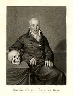 Johann Christian Reil (1759 - 1813) war Professor der Medizin und Stadtphysikus in Halle a. d. Saale. Mit dieser Schrift von 1803 gilt er als Begründer der naturwissenschaftlichen Psychiatrie (Lehre vom Gehirn als dem Organ der Seele).[1]