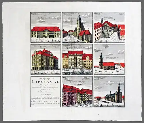 Scenographiae Lipsiacea folium secundum. Alt koloriertes Kupferstichblatt 43,5 x 42 cm (43,5 x 57,5 cm Plattenrand) von Joachim Ernst Scheffler (1749), Architekt und Sachsen-Weißenfelsischer Hofbaumeister. Im Alter von 60 Jahren 1751 in Leipzig verstorben. (THIEME-BECKER XXX. Bd., S.8).