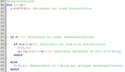 Weiterhin wird die Anfangskonzentration c0 festgesetzt. Nun folgt eine Arbeitsschleife, die die neue Konzentration in Abhängigkeit der Startparameter berechnet. Durch C=[C,x] wird die neue Konzentration in den C-Array abgespeichert. Zuletzt wird ein dreidimensionales Koordinatensystem geplottet, wobei die X-Achse die Zeit, die Y- Achse der Weg und die Z-Achse die Konzentration in Abhängigkeit von Weg und Zeit darstellt.