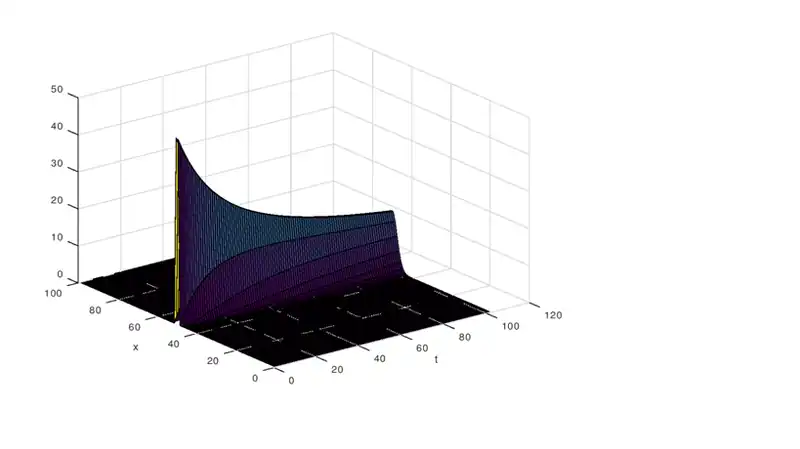 Abschließend wird nach abgeschlossener Berechnungen nach der betrachteten Zeitdauer nt das Konzentrationsprofil grafisch durch den Befehl surf ausgegeben, wie in Abb. 3 exemplarisch dargestellt.
