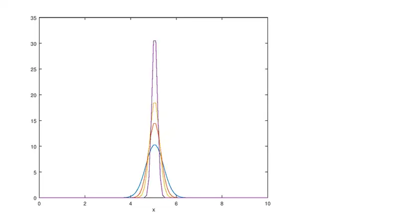 Nach Beendigung der Schleife gibt uns Octave ein, wie unten zu sehen, zweidimensionales Koordinatensystem aus, das auf der X-Achse den Weg und auf der Y-Achse die Konzentration angibt. Die Ausgabe gibt hier vier Kurven an, die die Ausbreitung des Schadstoffes in Abhängigkeit der Konzentration und der Zeit darstellen. Die Zeitpunkte wurden vorher fest gewählt.