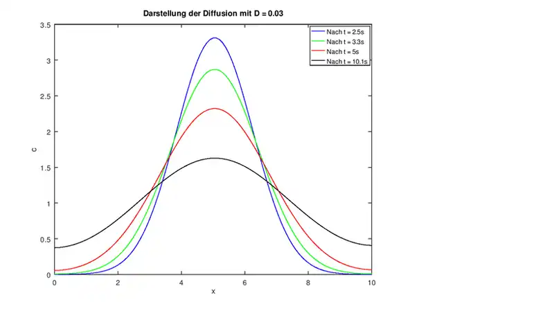 Wie bereits am Ende des 2. Durchgangs geschildert, war die Achseneinteilung fehlerhaft bzw. falsch dimensioniert, was nun durch eine separate Definition von x- und y-Arrays angepasst wird. Außerdem wurde die Beschriftung der grafischen Darstellung so angepasst, dass der Diffusionskoeffizient sowie die Dimension der Achsen angezeigt wird (Abb. 7).