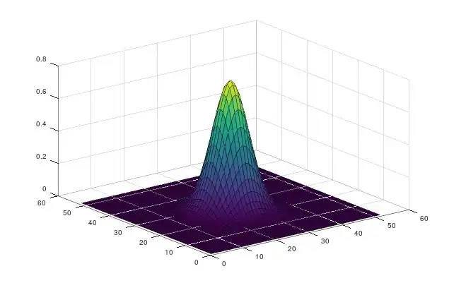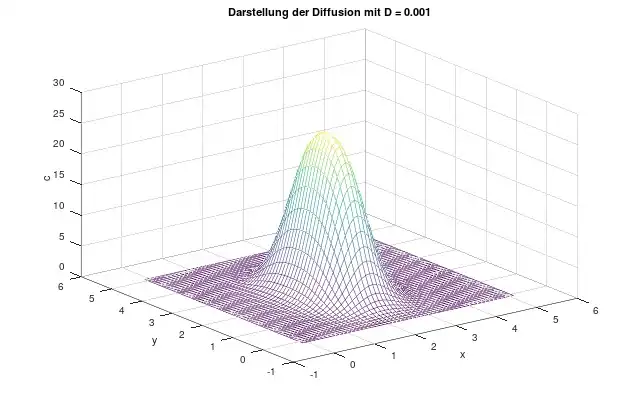 Im ersten Durchlauf soll ein erster Lösungsansatz der 2D-Diffusions-Differentialgleichung in Octave implementiert werden. Dazu wird von einem festen Zeit- und Wegschritt bzw. und von 1 ausgegangen, wodurch sich für ergibt. Um fehlerhafte Berechnungen zu vermeiden, werden die Randpunkte des betrachteten Gebietes 0 gesetzt und nur innerhalb dieses Randes neue Konzentrationswerte berechnet.