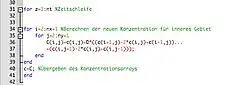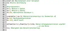 Nachdem eine Startkonzentration in der Mitte des betrachteten Gebietes für einen Ortspunkt, sowie die Startparameter, wie in Abb. 1 dargestellt, festgelegt wurden, wird die Berechnung neuer Konzentrationswerte nach der Zeitdauer durch eine FOR-Schleife realisiert. Innerhalb dieser Zeitschleife wird jeweils für jeden Raumpunkt die neue Konzentration in Abhängigkeit der umliegenden Konzentrationswerte berechnet, was durch zwei weiteren FOR-Schleifen umgesetzt wird (siehe Abb. 2).