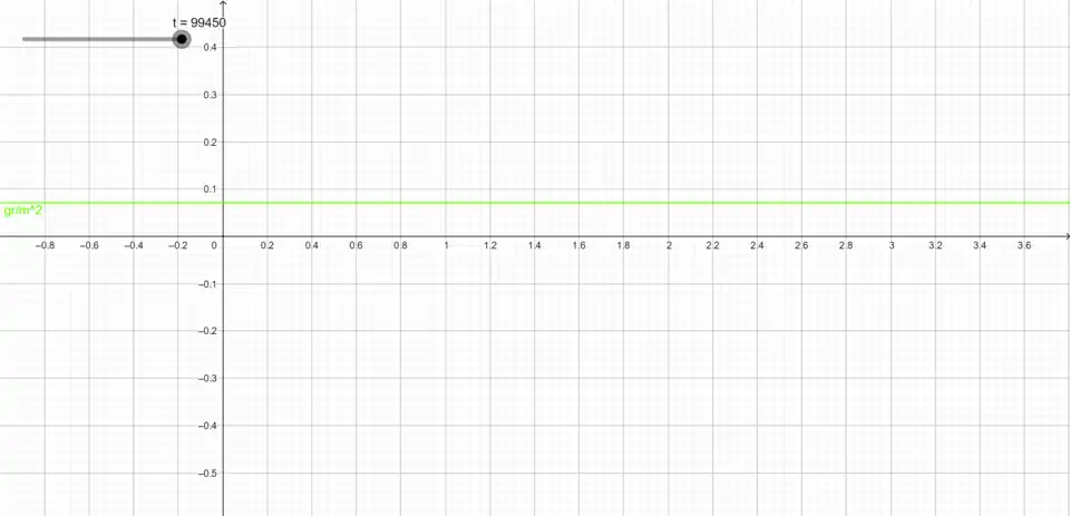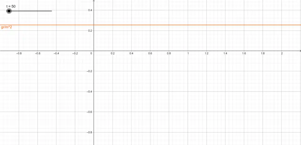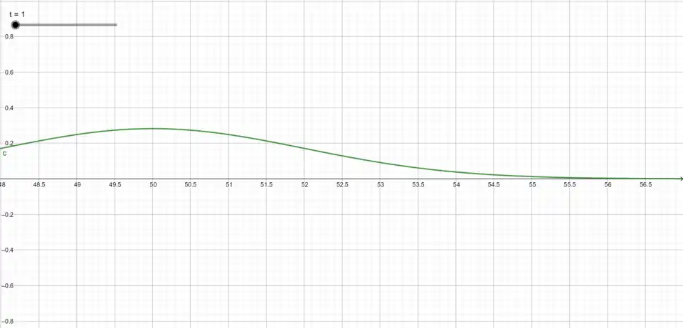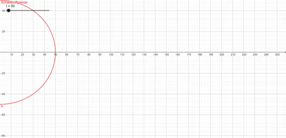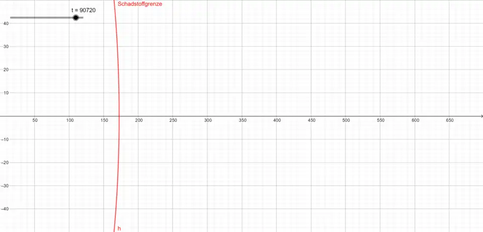 Um die Frage, wann der Schadstoff an welchem Punkt im See angekommen ist, zu beantworten, erstellen wir eine Funktion in Abhängigkeit von der Länge des Sees (x) und der Zeit seit dem Austritt des Schadstoffs (t). T wird als Schieberegler, mit einer Spanne von 0 bis 1200, angelegt, wobei jeder Schritt für eine Sekunde steht. Der Ursprung wird als Austrittsort festgelegt. Mithilfe des Satzes von Pythagoras lässt sich nun die passende Breite in Abhängigkeit von x und t berechnen. X darf hierbei nicht größer als 1000 werden, da der See nur die Länge von 1000 Meter hat.