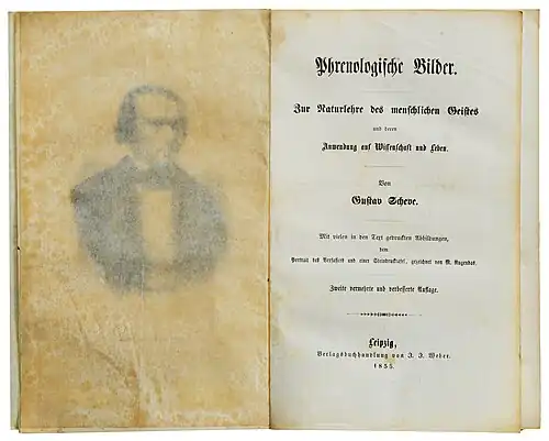 Scheve, Gustav: Phrenologische Bilder. Zur Naturlehre des menschlichen Geistes und deren Anwendung auf Wissenschaft und Leben Mit vielen in den Text gedruckten Abbildungen, dem Portrait des Verfassers und einer Steindrucktafel, gezeichnet von M. Rugendas. Zweite vermehrte und verbesserte Auflage. Leipzig: J. J. Weber [1852 -] 1855.