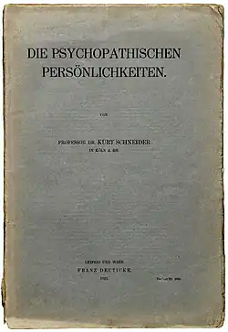 Schneider, Kurt: Die psychopathischen Persönlichkeiten oder der Seelenstörungen und ihrer Behandlung. Leipzig und Wien: F. Deuticke 1923, 96 S., Erstdruck.