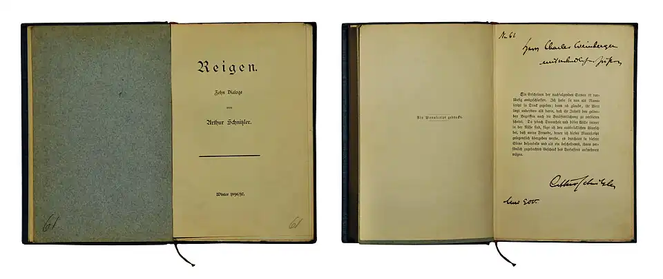 Schnitzler, Arthur: Reigen. Zehn Dialoge. Von Arthur Schnitzler. Winter 1896/97. Als unverkäufliches Manuskript gedruckt.