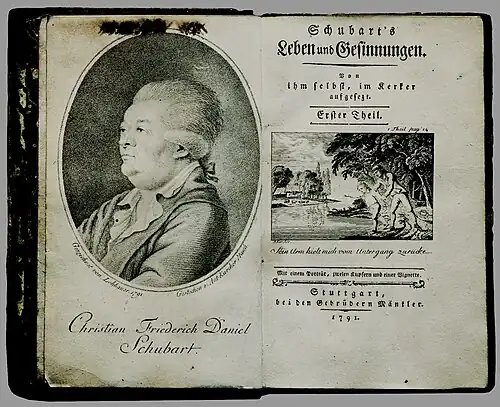 [Christian Daniel] Schubart´s Leben und Gesinnungen. Von ihm selbst, im Kerker aufgezeigt. Erster Theil. Mit einem Porträt, zwei Kupfern und einer Vignette. Stuttgart: Mäntler 1791, 292 S., Erstausgabe.