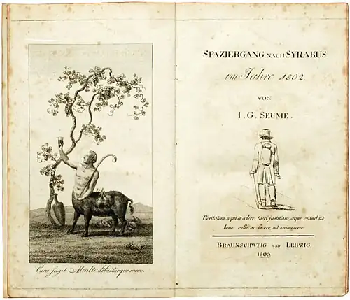 Seume, Johann Gottfried: Spaziergang nach Syrakus im Jahre 1802. Braunschweig und Leipzig [Hartknoch] 1803, 491 S., gestochener Titel und Kupfer als Frontispiz.