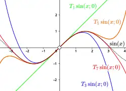 Approximation von sin(x) durch Taylorpolynome T vom Grad 1, 3, 5 und 7Animation: Die Kosinusfunktion um die Stelle 0 entwickelt, in sukzessiver Näherung