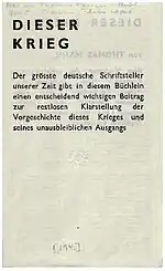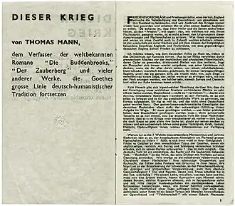 Zeitnah nachgedruckt, ohne Angaben von Ort und Jahr, vermutlich 1940/41 (Abb. rechts), kursierte der Text als kleinformatiger Tarndruck in Deutschland mit dem Titel: «Der größte deutsche Schriftsteller unserer Zeit gibt in diesem Büchlein einen entscheidenden Beitrag zur restlosen Klarstellung der Vorgeschichte diese Krieges und seines unausbleiblichen Ausgangs.» Die Einleitung des Tarndrucks weicht von der englischen Fassung im Jahr des Erstdrucks [2] ab.[3] Hergestellt wurde der Tarndruck vermutlich außerhalb Deutschlands, denn die Druckerei verfügte über keine ß-Drucktype.[4] Dieser Tarndruck diente in den von Kurzke und Stachorsky herausgegebenen Essays Thomas Manns als Druckvorlage.[5] Der Tarndruck enthält einige Kürzungen gegenüber dem Typoskript, die Kurzke und Stachorski im Anhang ihres Essaybandes zitieren. 1960 war in den Gesammelten Werken des Verlags S. Fischer der Essay in Band XII erstmals, dem Typoskript im Thomas Mann-Archiv in Zürich folgend, veröffentlicht worden.