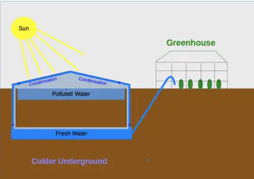 - Entsalzung - Solar Seawater Still (SSS): Wasser ist ein kostbares Gut, das gilt insbesondere in trockenen Gebieten. In heißen und trockenen Gebieten verdunstet Wass durch die Sonneneinstrahlung. Auf der linken Seite im Bild sieht man z.B. einen Behälter mit Meerwasser,