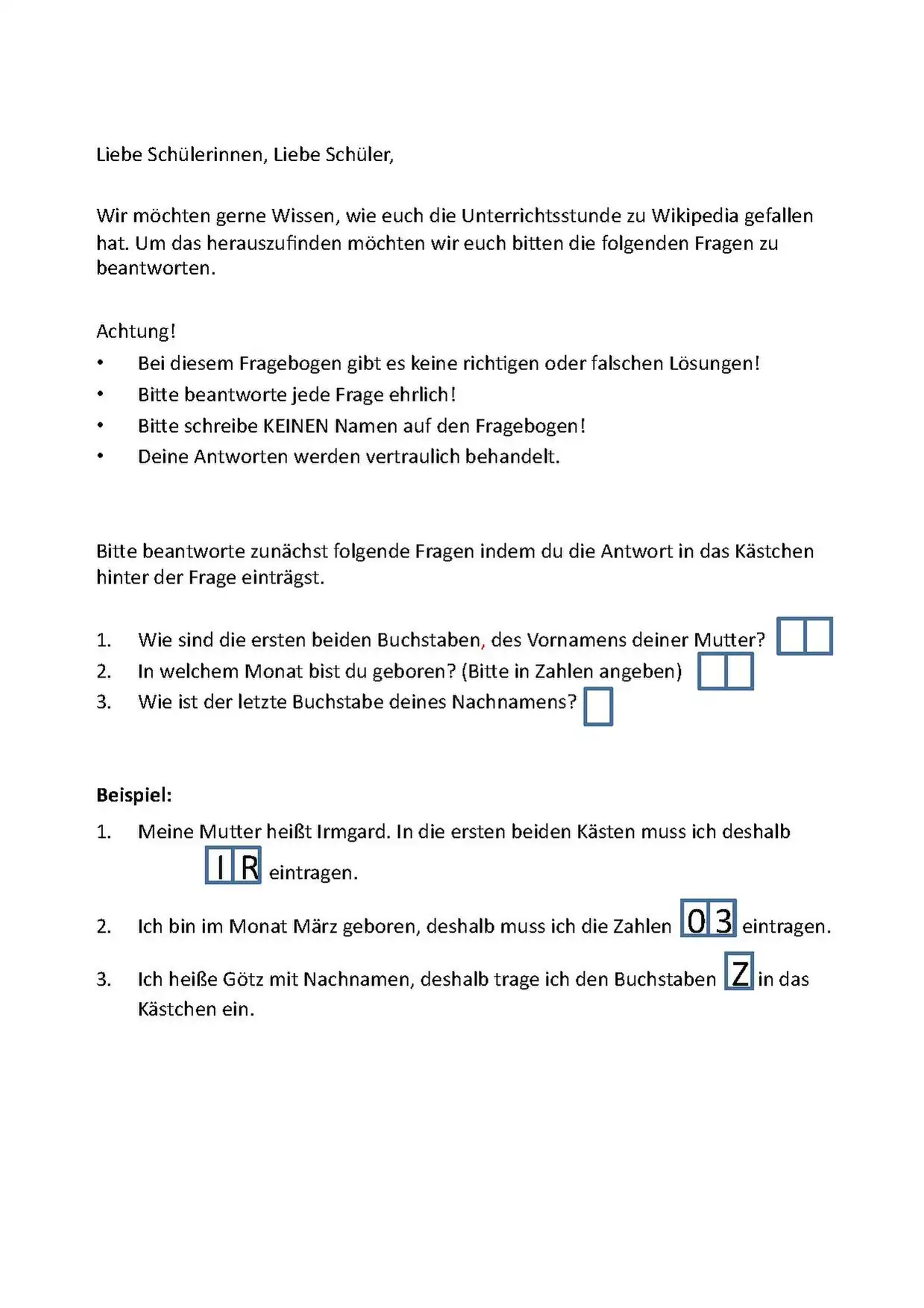 Der Wissensfragebogen kann entweder direkt nach der Stunde an die SchülerInnen verteilt werden, oder auch einige Tage später. Außerdem ist es möglich, den Fragebogen als Vorher/Nachher-Messung zu verwenden. Dann wird der Fragebogen vor dem Unterricht (ggf. auch bereits einige Tage vorab oder in der Stunde vorher) von den SchülerInnen ausgefüllt und dann nach der Unterrichtseinheit nochmals. Es empfiehlt sich zwischen dem Ausfüllen der beiden Fragebögen einige Tage verstreichen zu lassen. Wenn die SchülerInnen den Fragen innerhalb einer Unterrichtseinheit zweimal ausfüllen, kann es sein, dass sie dadurch demotiviert sind und beim zweiten Beantworten nicht mehr konzentriert sind.