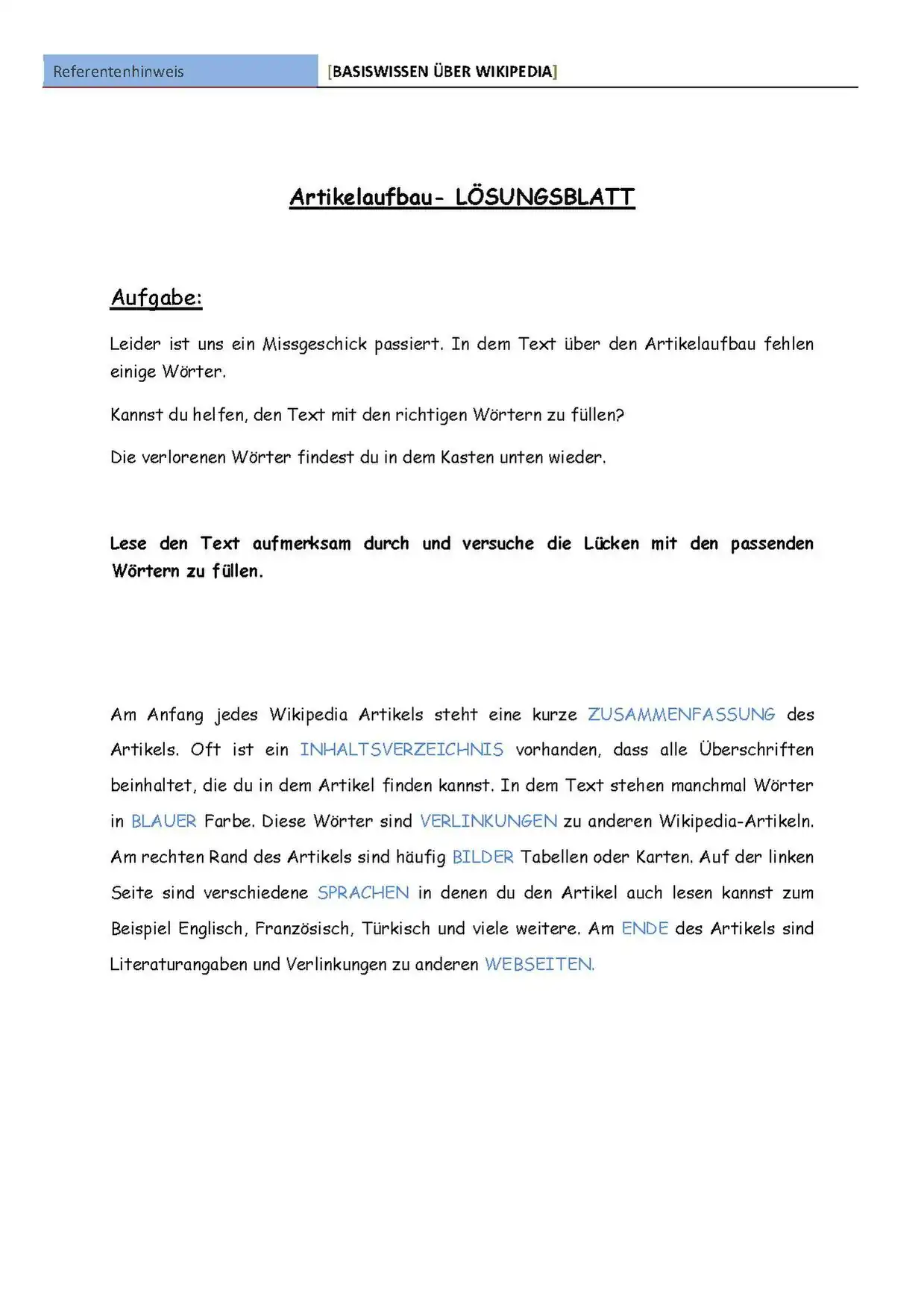 Die Schüler lernen, was eine Enzyklopädie ist, welche Textarten sie beinhaltet, sowie den Umgang und Nutzen dieser. Beispielhaft für eine Enzyklopädie des heutigen Zeitalters wird die Wikipedia vorgestellt und ihre Inhalte und Funktionen erarbeitet. Die Schüler sollten in der Lage sein selbständig einen Artikel zu öffnen, den Aufbau des Artikels ver-stehen und beim Lesen nutzen können, sowie verschiedene Sprachen für einen Artikel wählen können. Es sollte vermittelt werden, dass Wikipe-dia viele Themenbereiche abdeckt und neben dauerhaft präsenten The-men aktuelle Nachrichten verfolgt werden können. Der Unterschied zwischen neuartigen Online-Lexika (am Beispiel der Wikipedia) und herkömmlichen Lexika werden verdeutlicht.