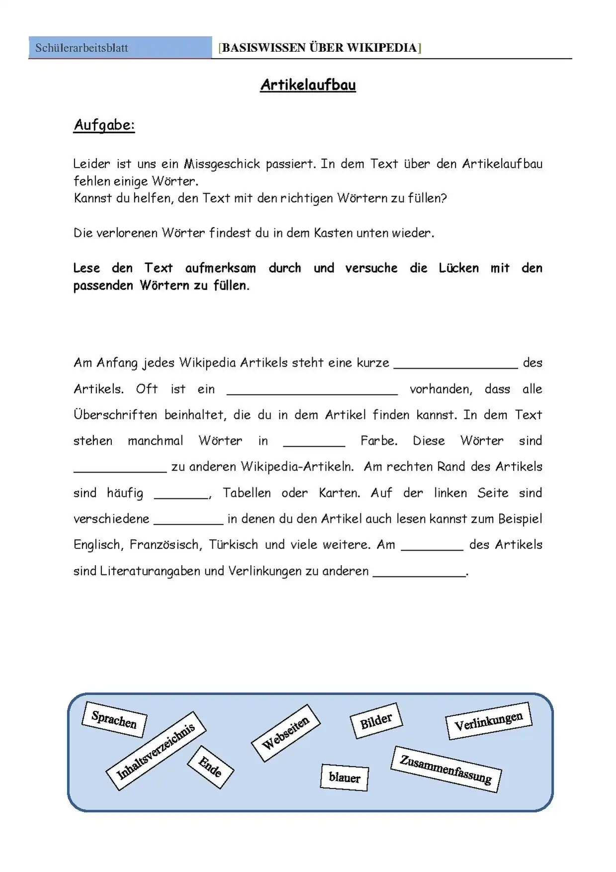 Arbeitsblätter für Schüler