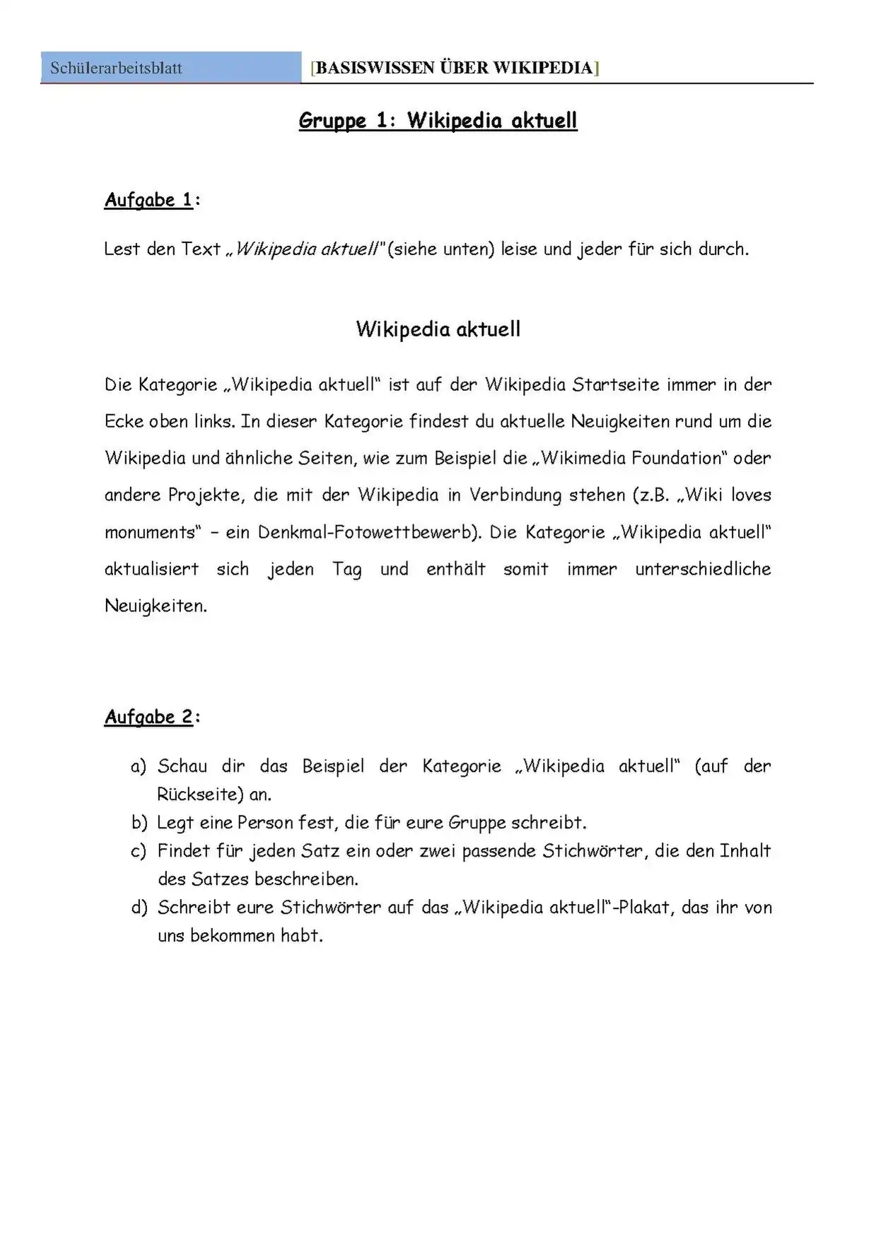 Nach einer kurzen Erfassung des Hintergrundwissens der SchülerInnen wird in der ersten thematischen Sequenz kurz erläutert, was die Wikipedia genau ist. Schülern ohne Vorwissen soll hiermit ein Grundrahmen der Thematik geliefert werden. Anschließend wird in einem Vergleich auf den Begriff der Enzyklopädie am Beispiel der Wikipedia und des Brockhaus eingegangen. Des Weiteren erarbeiten die SchülerInnen unterschiedliche Inhaltsbereiche und Funktionen der Wikipedia im Rahmen einer Gruppenarbeit und präsentieren ihre Ergebnisse anschließend im Plenum. Zentrale Bestandteile der Gruppenarbeit sind folgende Elemente der Wikipedia Startseite: Suchfunktion, Wikipedia Aktuell, Artikel des Tages, In den Nachrichten, Kürzlich Verstorben, Was geschah am…? und schon gewusst. Nachdem die SchülerInnen die Wikipedia im Rahmen der Gruppenarbeit inhaltlich kennen gelernt haben, erarbeiten sie im Rahmen eines geleiteten Unterrichtsgespräches - gemeinsam mit dem Lehrer - den Unterschied zwischen Online-Enzyklopädien und herkömmlichen Enzyklopädien, wie beispielsweise dem Brockhaus. In einem abschließenden Lückentext eignen sich die SchülerInnen den Aufbau eines Wikipedia-Artikels an. Die Ergebnisse der Stillarbeit werden anschließend im Plenum besprochen.
