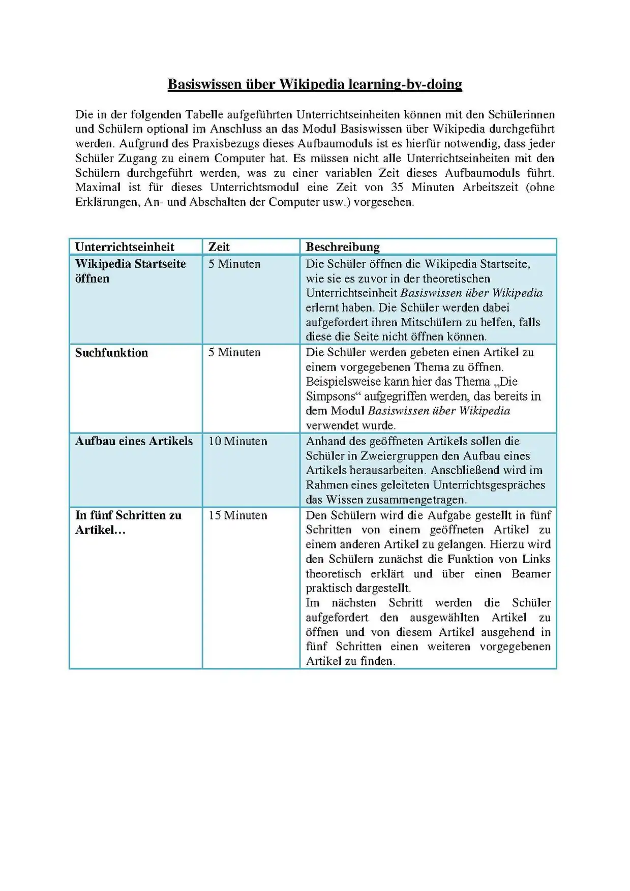 Das praxisbezogene Modul „Basiswissen über Wikipedia learning-by-doing“ kann an das Modul Basiswissen über Wikipedia angeschlossen werden. Kurzinformationen zu diesem Modul befinden sich im Anhang. Des Weiteren kann das vorliegende Modul als Grundlage für weitere Module verwendet werden, wie beispielsweise: Wikipedia in der Schule: Referate, Hausarbeiten und Co und Qualität in der Wikipedia