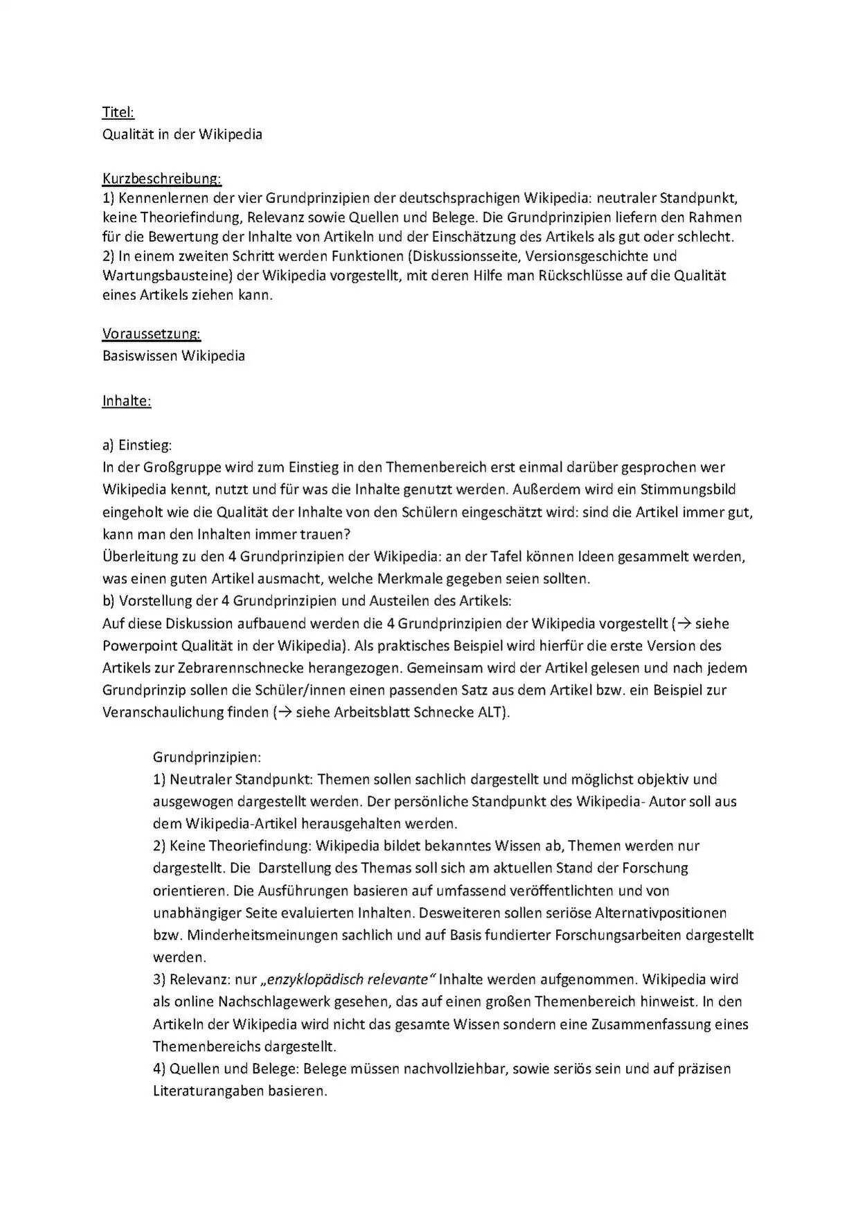 Die SchülerInnen erarbeiten Merkmale, mit deren Hilfe sie die Qualität der Inhalte eines Artikels als gut oder schlecht einzuschätzen lernen. Hierfür werden ihnen die vier Grundprinzipien der Wikipedia, sowie Wartungsbausteine und grundlegende Funktionen (Diskussionsseite, Versionsgeschichte) vorgestellt.