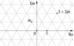Die Eisenstein-Zahlen enthalten den Ring . Im obigen Bild besteht dieser Ring aus jeder zweiten horizontalen Zeile des Gitters und ist damit ein rechtwinkliges Gitter. Es gilt der folgende Satz.