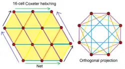A 16-cell can be constructed (three different ways) from two Boerdijk–Coxeter helixes of eight chained tetrahedra, each bent in the fourth dimension into a ring.[18][19] The two circular helixes spiral around each other, nest into each other and pass through each other forming a Hopf link. The 16 triangle faces can be seen in a 2D net within a triangular tiling, with 6 triangles around every vertex. The purple edges represent the Petrie polygon of the 16-cell. The eight-cell ring of tetrahedra contains three octagrams of different colors, eight-edge circular paths that wind twice around the 16-cell on every third vertex of the octagram. The orange and yellow edges are two four-edge halves of one octagram, which join their ends to form a Möbius strip.