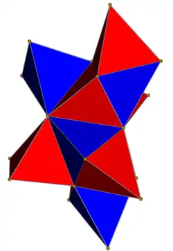 It is the 4-dimesional member of an infinite family of polytopes called cross-polytopes, orthoplexes, or hyperoctahedrons which are analogous to the octahedron in three dimensions. It is Coxeter's polytope.[4] The dual polytope is the tesseract (4-cube), which it can be combined with to form a compound figure. The cells of the 16-cell are dual to the 16 vertices of the tesseract.