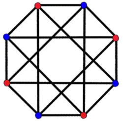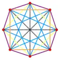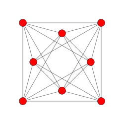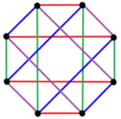 - ↑ All five views are the same orthogonal projection of the 16-cell into the same plane (a circular cross-section of the eight-cell ring cylinder), looking along the central axis of the cut ring cylinder pictured above, from one end of the cylinder. The only difference is which √2 edges and √4 chords are omitted for focus. The different colors of √2 edges appear to be of different lengths because they are oblique to the viewer at different angles. Vertices are numbered 1 (top) through 8 in counterclockwise order.