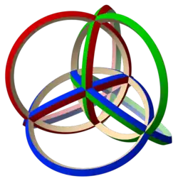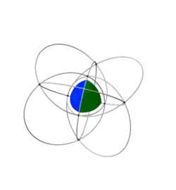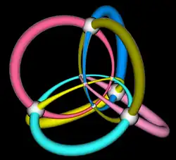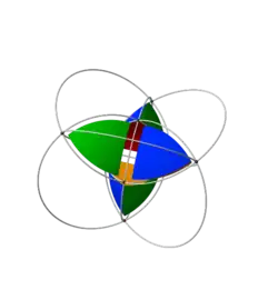 - ↑ 20.0 20.1 20.2 20.3 An isocline is a circle of special kind corresponding to a pair of Villarceau circles linked in a Möbius loop. It curves through four dimensions instead of just two. All ordinary circles have a 2𝝅 circumference, but the 16-cell's isocline is a circle with an 4𝝅 circumference (over eight 90° chords). An isocline is a circle that does not lie in a plane, but to avoid confusion we always refer to it as an isocline and reserve the term circle for an ordinary circle in the plane.