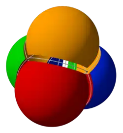 - ↑ The four edges of each 4-orthoscheme which meet at the center of a regular 4-polytope are of unequal length, because they are the four characteristic radii of the regular 4-polytope: a vertex radius, an edge center radius, a face center radius, and a cell center radius. The five vertices of the 4-orthoscheme always include one regular 4-polytope vertex, one regular 4-polytope edge center, one regular 4-polytope face center, one regular 4-polytope cell center, and the regular 4-polytope center. Those five vertices (in that order) comprise a path along four mutually perpendicular edges (that makes three right angle turns), the characteristic feature of a 4-orthoscheme. The 4-orthoscheme has five dissimilar 3-orthoscheme facets.