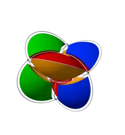 - ↑ 15.0 15.1 15.2 15.3 Each great square plane is isoclinic (Clifford parallel) to five other square planes but completely orthogonal to only one of them. Every pair of completely orthogonal planes has Clifford parallel great circles, but not all Clifford parallel great circles are orthogonal. There is also another way in which completely orthogonal planes are in a distinguished category of Clifford parallel planes: they are not chiral. A pair of isoclinic (Clifford parallel) planes is either a left pair or a right pair unless they are separated by two angles of 90° (completely orthogonal planes) or 0° (coincident planes).[22] Most isoclinic planes are brought together only by a left isoclinic rotation or a right isoclinic rotation, respectively. Completely orthogonal planes are special: the pair of planes is both a left and a right pair, so either a left or a right isoclinic rotation will bring them together. Because planes separated by a 90° isoclinic rotation are 180° apart, the plane to the left and the plane to the right are the same plane.[v]