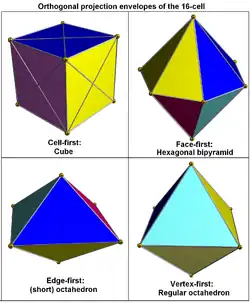 - ↑ Coxeter 1973, p. 121, § 7.21. See illustration Fig 7.2B: " is a four-dimensional dipyramid based on (with its two apices in opposite directions along the fourth dimension)."