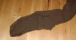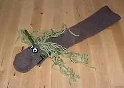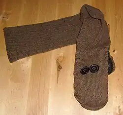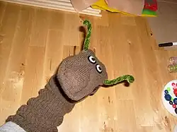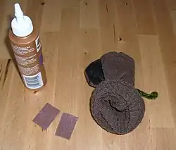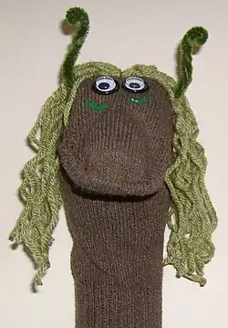 Basic material for the troll is a brown cotton men's sock. Exact measurement depends on the size of the puppeteer's hand. The end of the sock may project beyond the puppeteer's fingers, but the mouth itself should not curl with the puppeteer's hand. The cut for the mouth begins from the toe seam.