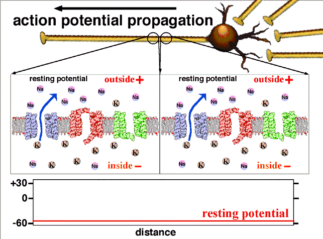 This animated gif illustrates action potential propagation in an axon. Three types of ion channel are shown: potassium "leak" channels (blue), voltage-gate sodium channels (red) and voltage-gated potassium channels (green). The movement of positively-charged sodium and potassium ions through these ion channels controls the membrane potential of the axon. The negative-inside resting potential is mostly determined by potassium ions leaving the cell through leak channels. Action potentials are initiated in the axon initial segment after neurotransmitter activates excitatory receptors in the neuron's dendrites and cell body. This depolarizes the axon initial segment to the threshold voltage for opening of voltage-gated sodium channels. Sodium ions entering through the sodium channels shift the membrane potential to positive-inside, approaching the sodium equilibrium potential. The positive-inside voltage during the action potential in the initial segment causes the adjacent part of the axon membrane to reach threshold. When positive-inside membrane potentials are reached, voltage-gated potassium channels open and voltage-gate sodium channels close. Potassium ions leaving the axon through voltage-gated potassium channels return the membrane potential to negative-inside values near the potassium equilibrium potential. When the voltage-gated potassium channels gate shut, the membrane potential returns to the resting potential.