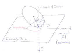 To conserve energy the angular velocity must remain on the ellipsoid of inertia and the orientation of ellipsoid of inertia determines the orientation of the body. We can use the conservation of angular momentum to orient the ellipsoid. If we remember that we see that the normal to the ellipsoid of inertia is the angular momentum; therefore, as the ellipsoid of inertia rotates about the angular velocity, it must remain tangent to a plane perpendicular to the angular momentum, the invariable plane. Furthermore, the angular velocity is restricted to move along the ellipsoid of inertia along curves of constant . This curve is called the polhode, and it traces the path of the angular velocity through the body. The angular velocity also traces a path in the invariable plane called the herpolhode. The herpolhode is the path of the angular velocity through space.