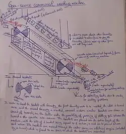 A open-source washing machine should be created. The washing machine is to have a induction engine for the drum and a brushless DC engine for pumping the machine dry after the wash. It probably best uses (the technology of; buying the modules from the company directly may be expensive) the Motion SPM in SMD or Tuny DIP housing. see Energy Saving through Motor Control and Motor app gains efficiency with electronic control Perhaps water-saving features may be added (see Washing_machine#Washing_machine_milestones 2008 Berkeley washer) Cleaning agents used should be eco-friendly; see Natural cleaning product