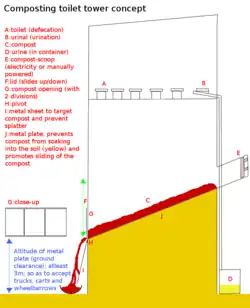 Extra's to add: - painting the chamber black, and adding increased ventilation trough natural ventilation techniques (trought the increased warming up of the chamber). Perhaps this may be done trough the pipe (if made of metal, the metal instead can be painted black and guide the heat down to the chamber). Also, the urine collection might be inmediattly outfitted with a small hose and (non-electrical) handpump to inmediately pump the urine to the food-production plot (so that these nutrients can be inmediattely transferred and do not need to wait out the emptying; pumping may be done after each toilet visit). Finally, perhaps the heat from the faeces composting and from the solar energy may be used to further heat up the hot water system (which will already be powered by tube collectors, but which still need additional heating for certain applications (offcourse an electric boiler will need to be installed too to attain the appropriate temperature). The latter can be done by heat exchanger (to avoid contact with the faeces).
