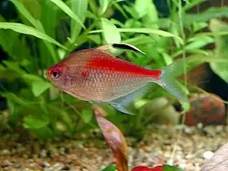 Bleeding hearts are generally peaceful fish, but fin nipping may become a problem, as males can be territorial. They are best kept in a small school (six or more) and not with fish with larger fins such as angelfish and bettas. They do well in a variety of community tanks, and like most tetras, do best in groups and with bushy plants. They are a suitable tankmate for corydoras and other bottom-dwelling species. With a few exceptions they are peaceful when surrounded by their own kind, like tiger barbs. They are also mischievous, nipping at others' tails and entering their territory looking for food.