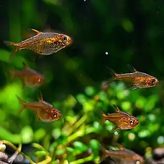 The ember tetra (Hyphessobrycon amandae) is a freshwater tropical fish native to the Araguaia River basin of Brazil. This species is of typical tetra shape, but grows to a maximum overall length of about 2 cm (0.7 in). Most exhibit striking orange and reddish coloration with mild translucency near their pelvic fins. Their eyes frequently mirror the color of the fish and are outlined in black. The fish's natural diet consist of small invertebrates and plants. Although somewhat hard to find in fish stores, H. amandae is commonly kept as an aquarium fish by hobbyists.