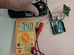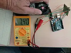 The first step is to see if the Motor and Light wire pairs change voltage without being plugged into the arduino. The RC transmitter has two controls, a wheel and a button with up and down arrows. This probably corresponds to the motor wire pairs. The RC transmitter has a battery and power on/off switch. After powering it on and pushing the wheel fully Counter Clock Wise (CCW), a voltage of 7.4 volts was recorded. Success!