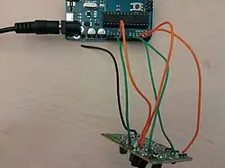 So the green wires are positive and orange wires are negative or ground. But the orange wires are really positive while the green are ground. So all four can be hooked up to the arduino. The idea was that three states could be detected by the arduino analog to digital pins. The power pair green was hooked to 5 volts. The power pair's orange was hooked to ground. Then motor 1 green and orange were connected to A0 and A1. Motor 2's pair were connected to A2 and A3.