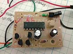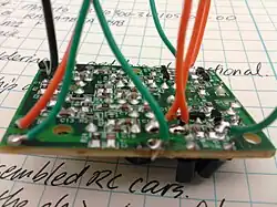 Bottom of RC/Motor control circuit taken from a toy RC car. The black wire attached to a corner is the receiving antenna. The orange and green wires are soldered to the motor 2 output. The black and red power wires go to a 9Volt battery snap type clip which powered the car. The red wire has broken off the board and has a switch in it. A single green wire is soldered to motor 1 + output.